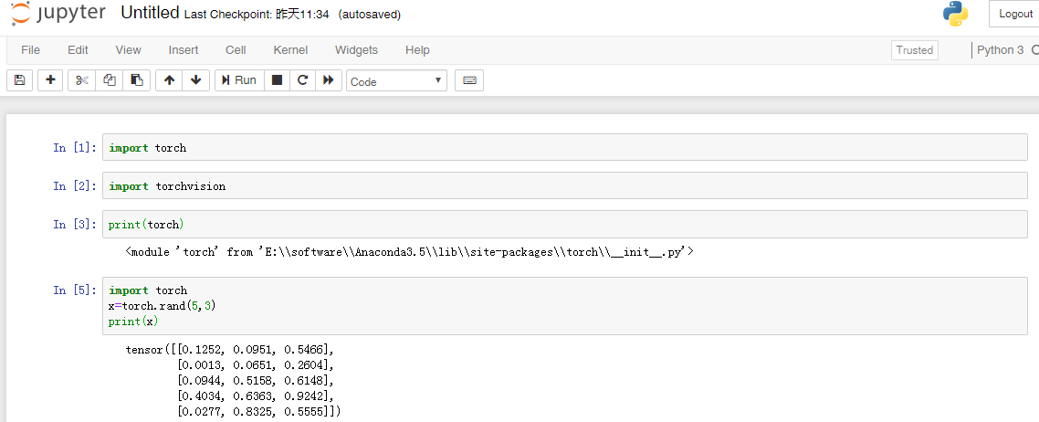 安装完毕后,验证是否安装成功,打开Anaconda的Jupyter新建python文件,运行demo:
